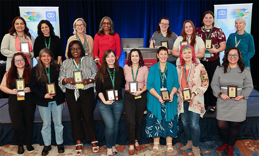 (Front): Allison Weaver, LMFT, Sacramento Valley; Kusum Punjabi, AMFT, Santa Clara Valley; Dr. Jane Akponye, LMFT, Inland Empire; Jennifer Stonefield, LMFT, Los Angeles; Emily Larkin, LMFT, Redwood Empire; Nanci Finley, LMFT, East Bay; Donna Chapman, PhD., LMFT, San Diego; Reesa Morala, LMFT, Southwest Riverside County (Back): Yesenia Rosado, AMFT, Long Beach-South Bay; Rachel Barr, LMFT, Marin County; Kathryn Bikle, LMFT, San Gabriel Valley; Joy Alafia, CAMFT; Corrina Zandakis, LCSW, Monterey County; Jodie Shea, LMFT, Orange County; Jennifer Calderon, LMFT, San Fernando Valley; and Linda Ankeney, LMFT, Sierra Foothills (Not shown): Kim Richards, LMFT, Central Coast; Akiah Robinson-Selwa, LMFT, Los Angeles; Marguerite "Meg" Ferrel, LMFT, Redding Regional; Kady Fleckenstein, LMFT, Santa Barbara; and Nadine Newman, LMFT, Sierra Foothills.